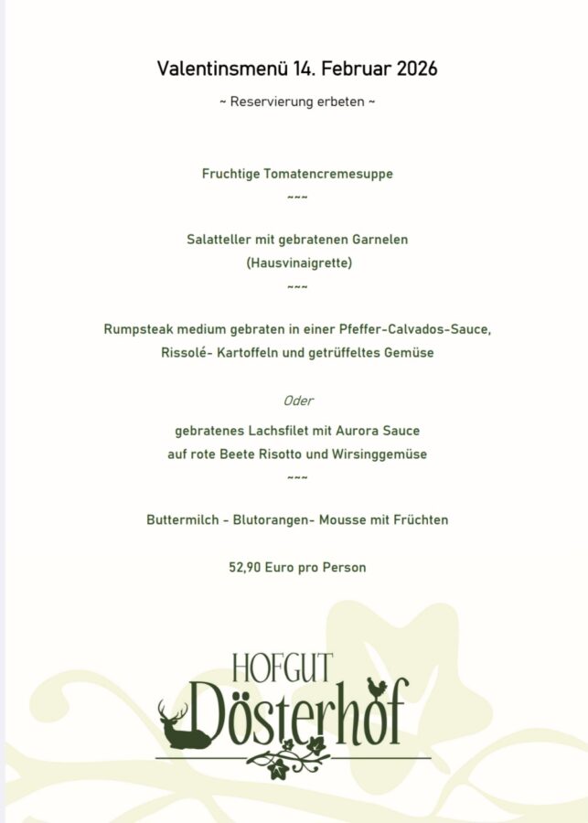 Bitte reservieren Sie vorab Ihren Tisch per Tel. 06871/6369020 oder per E-Mail an kontakt@doesterhof.de. Wir freuen uns, Sie an diesem besonderen Abend verzaubern zu dürfen.