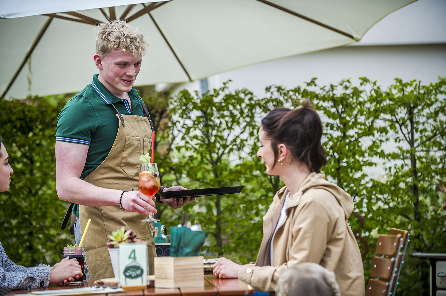Gäste im Biergarten in Interaktion mit dem Service